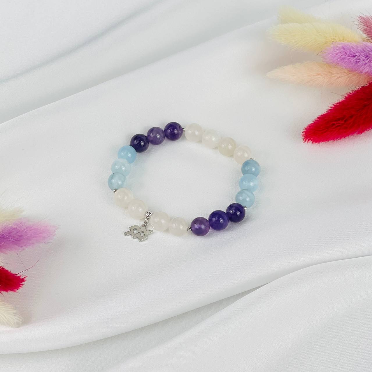 Браслет из Аквамарина, Аметиста и Лунного камня со знаком зодиака (Водолей)