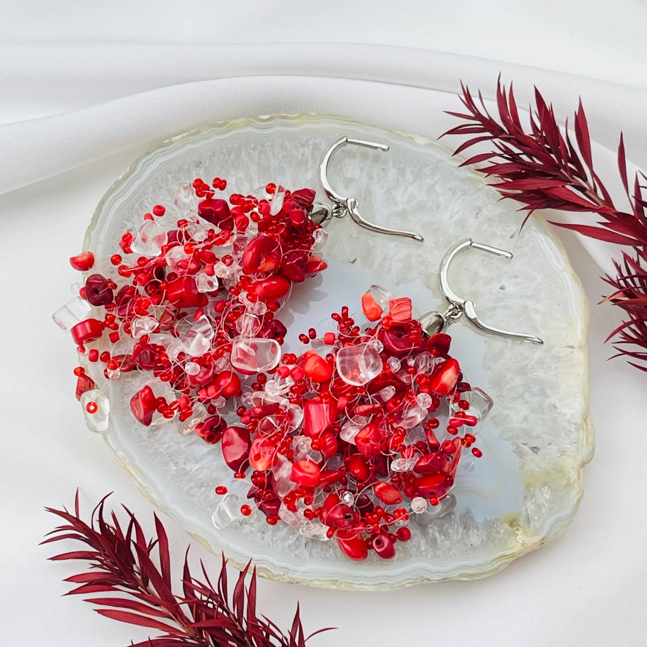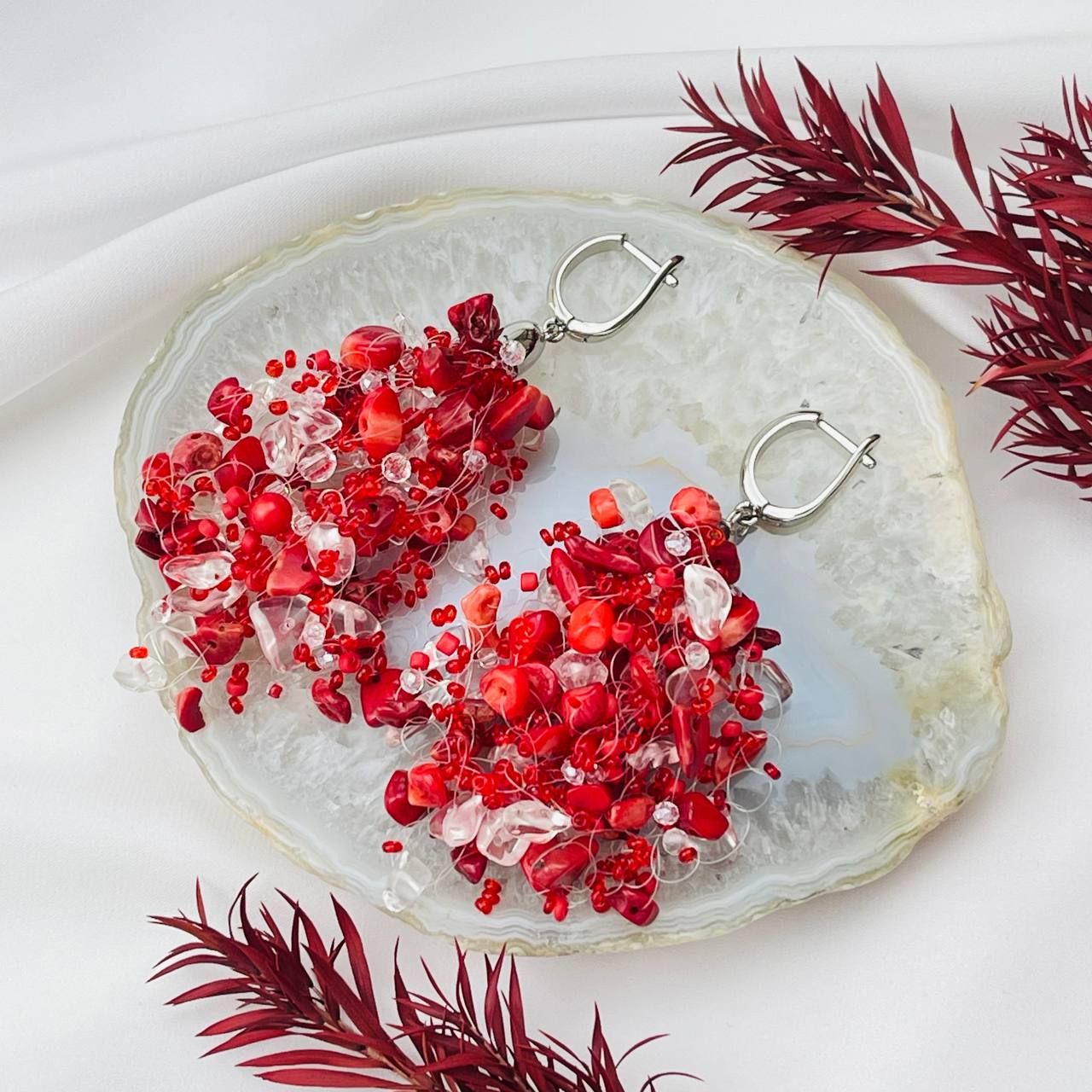 Серьги "Воздушки" из Коралла и Горного Хрусталя
