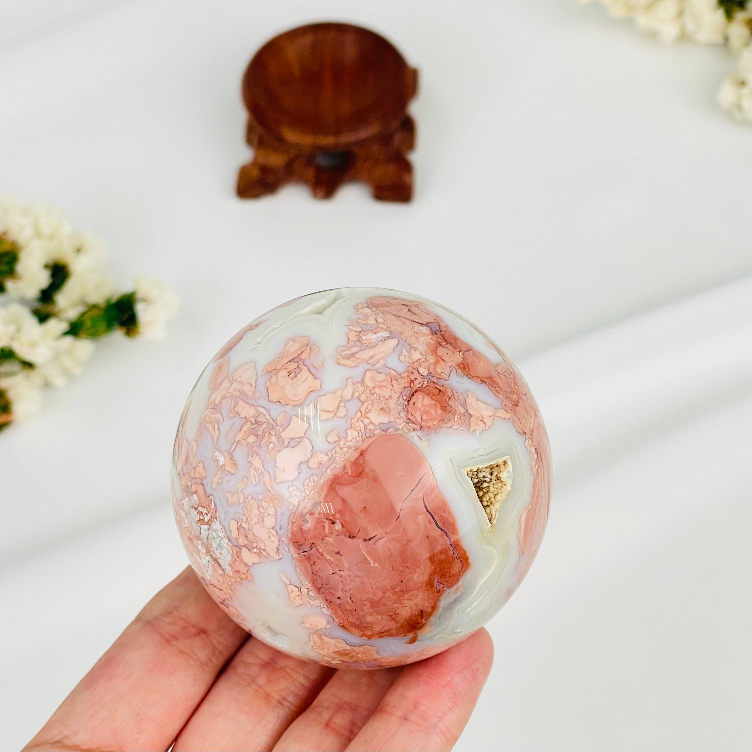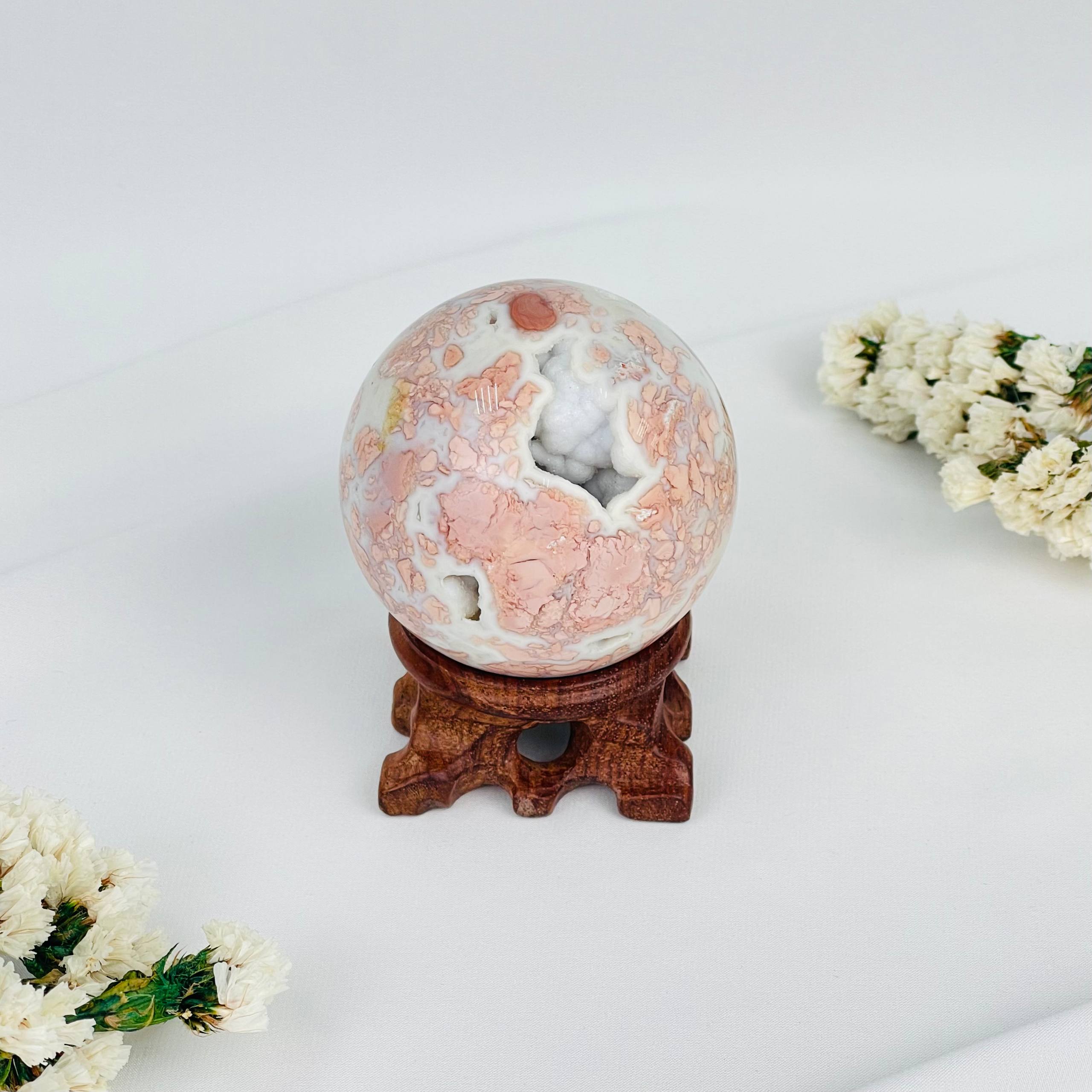 Шар из розового цветочного Агата на подставке